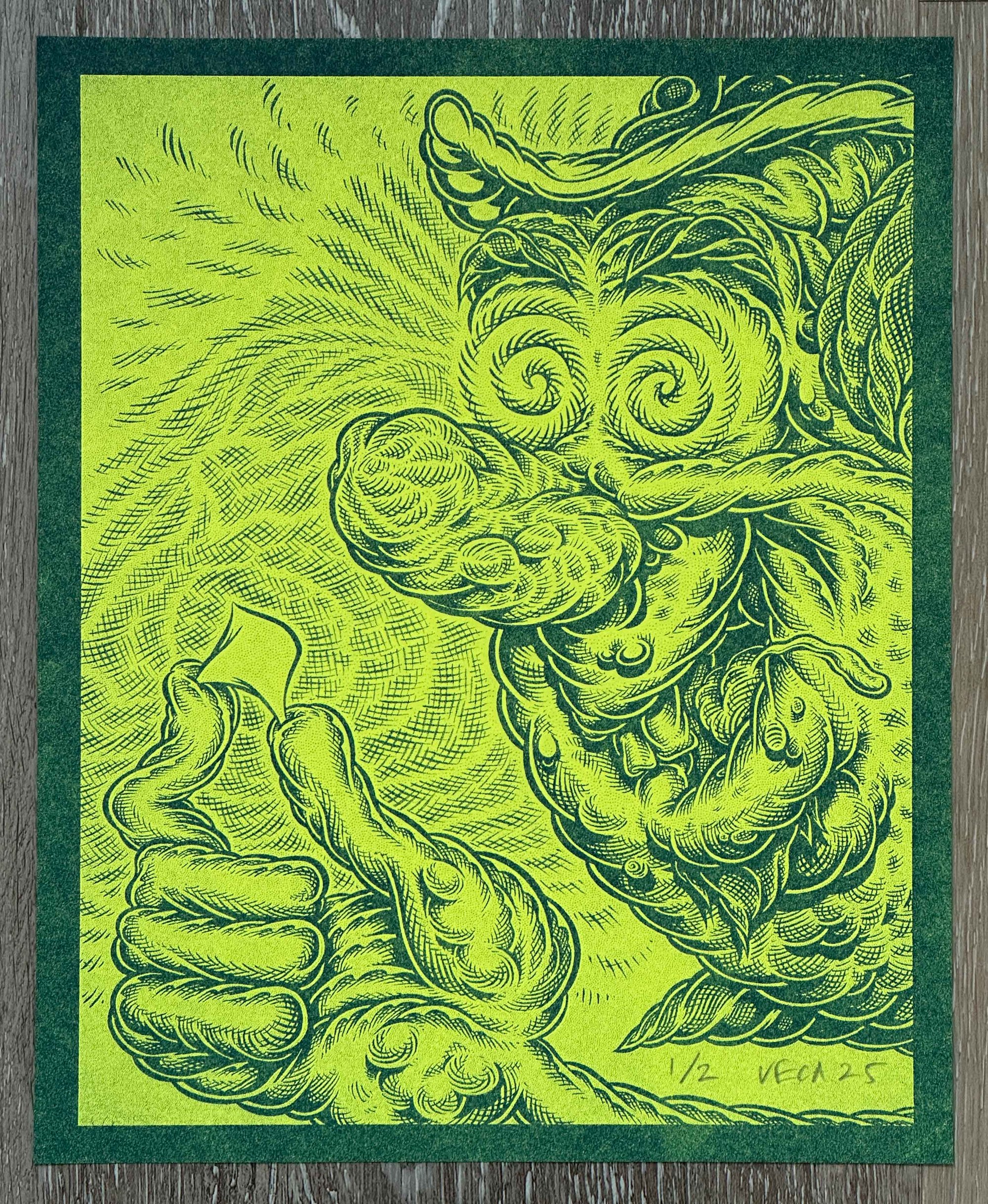 A Risograph print is a layered image produced by a digital stencil duplicator that uses soy-based, semi-translucent inks to create a unique texture and appearance, similar to a digital screen printer. Each color layer is printed one at a time, requiring a separate stencil for each, which leads to distinctive color blends, slight misregistration between layers, and a tactile, often imperfect aesthetic.